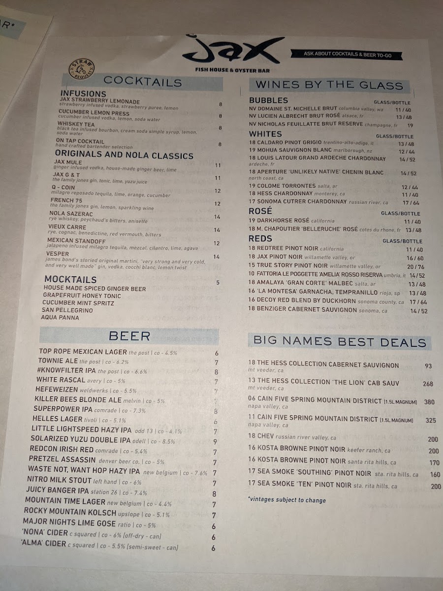 Welcome to Jax Fish House & Oyster Bar, a seafood haven located at 1539 17th St, Denver, CO. This bustling spot shines with a menu crafted around the freshest ingredients and innovative flavors. Whether you're diving into the rich Seafood Chowder or savoring the delicate Blue Crab Cacio e Pepe, each dish promises an explosion of taste.